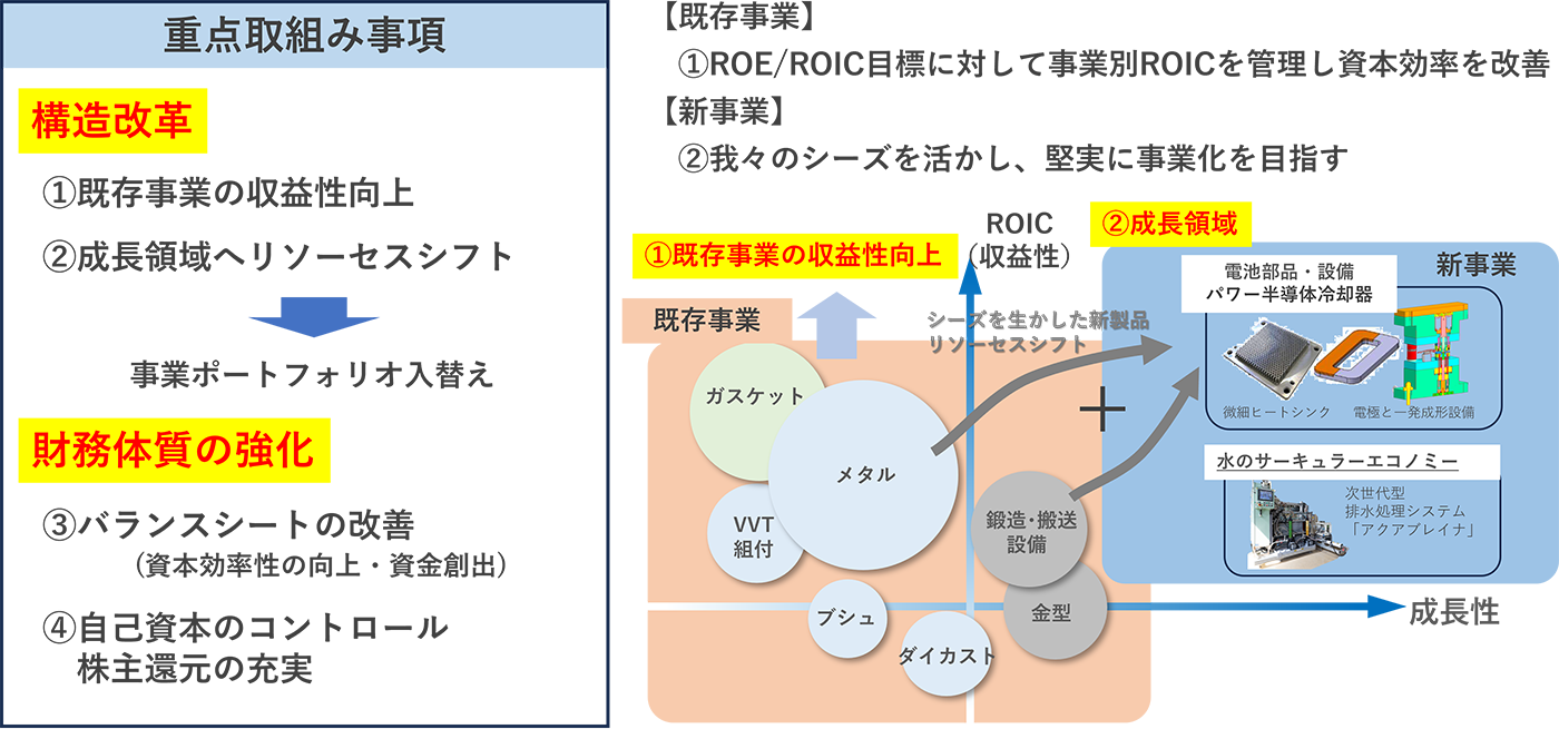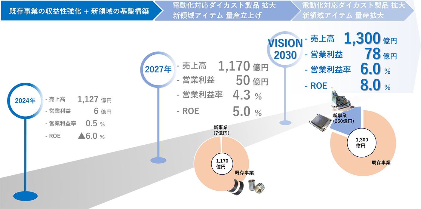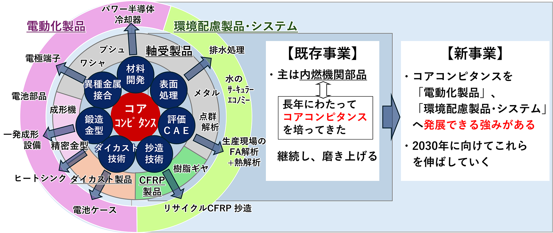 私たちは中期経営計画において、既存事業の利益率向上に取り組むとともに、長年培ってきた材料開発、接合技術、表面処理、ダイキャスト、評価/CAEといったコア技術をさらに磨き、電動化や環境配慮型製品・事業へと展開していきます。