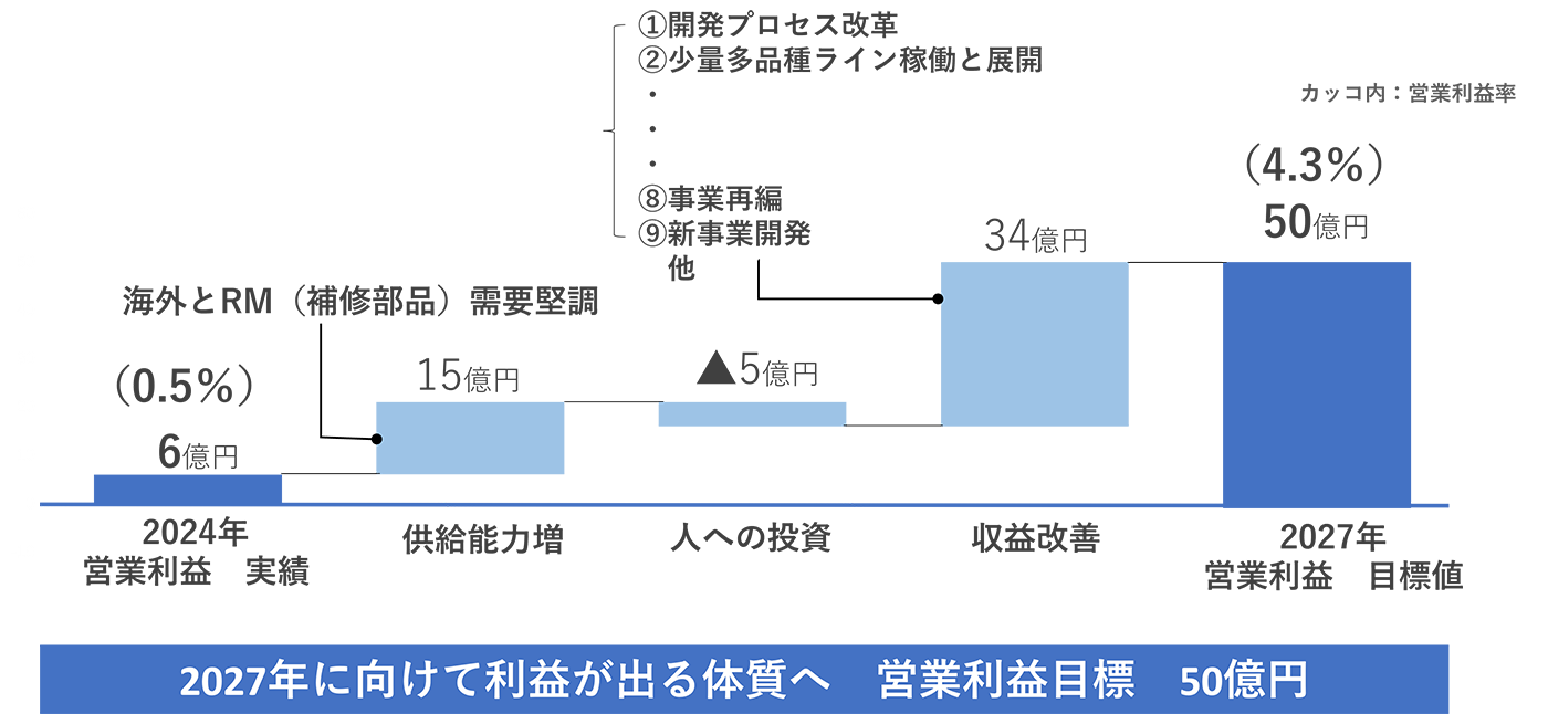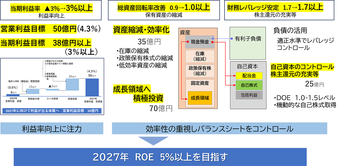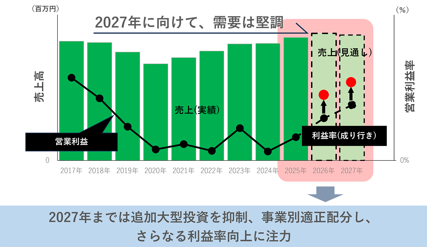 2027年に向けても顧客需要は堅調で、営業利益率は自然体でも拡大すると見込んでいます。当面は大型投資を抑えつつ、事業ごとに適正配分を行い、中期経営計画を着実に推進。稼ぐ力をさらに高め、持続的な成長基盤を築いていきます。