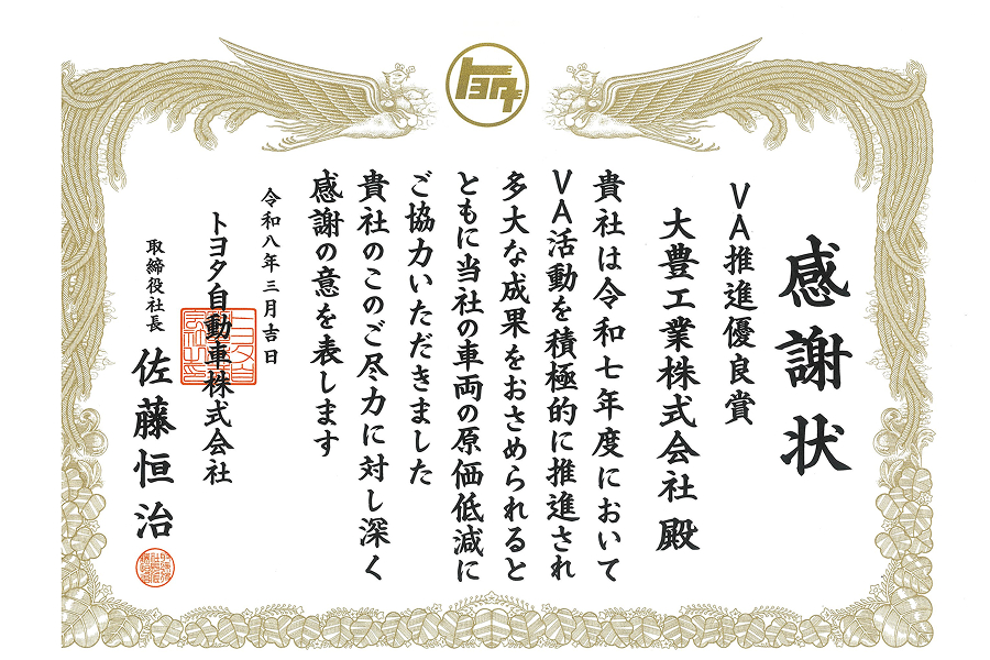 3月25日(水)、トヨタアリーナ東京(東京都江東区)で「2026 TOYOTA Supply Partners Convention」が開催され、トヨタ自動車株式会社より「令和7年度 VA推進優良賞」を受賞しました。これは、当社の全社VA活動推進の取り組みが評価されたことによるものです。 当社は今後ともお客様の信頼に応え、高品質な製品を提供してまいります。