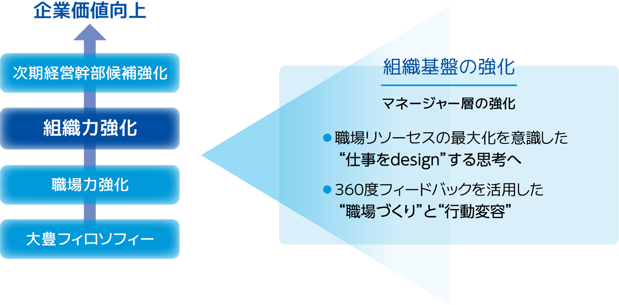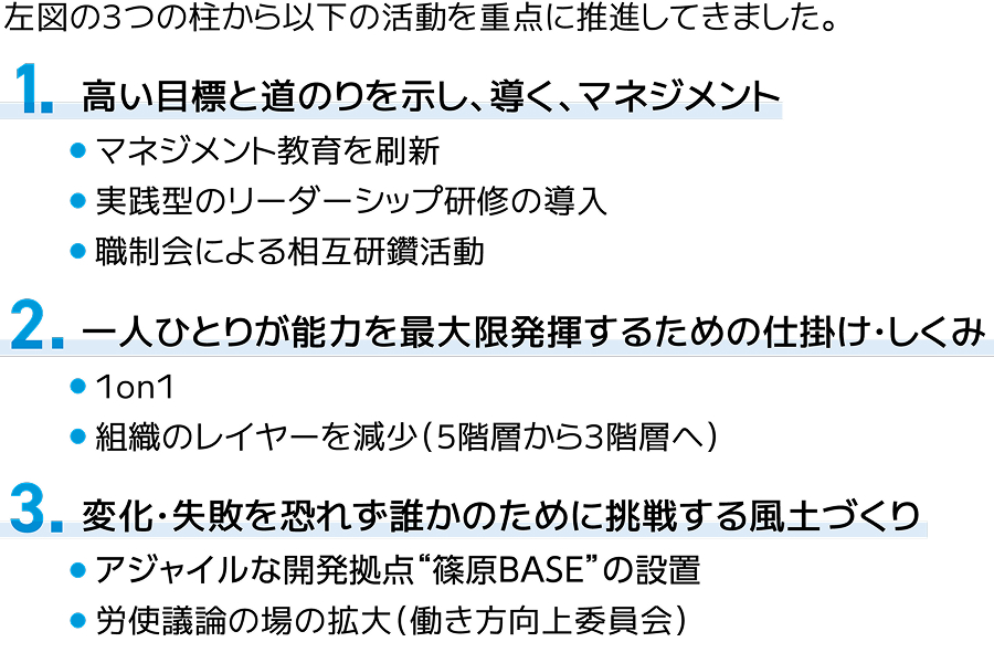 そのための基盤づくりとして、多様な人財が活躍できるよう、安心して働きやすい職場環境の維持・向上に取り組むとともに、従業員が日々の仕事において積極的に変革に挑戦する姿勢を重んじ、こうした挑戦があたり前に出来る仕掛けや、組織風土を築く活動に取り組んでいます。