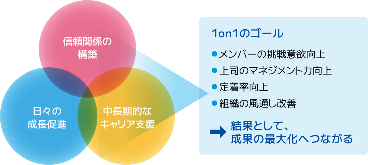 「社員一人ひとりが自らの意志で能力を高め、最大限に力を発揮できる環境づくり」を大切にしています。そのための取り組みの一つとして、定期的な1on1(ワン・オン・ワン)面談を導入しています。
